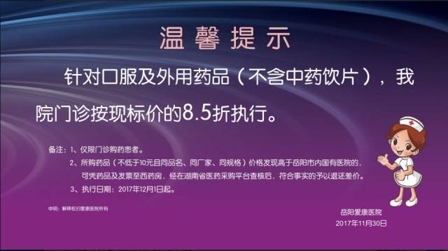 為破除“以藥養(yǎng)醫(yī)”,減輕民眾看病負(fù)擔(dān),根據(jù)湖南省醫(yī)藥采購平臺(tái)的標(biāo)準(zhǔn),岳陽愛康醫(yī)院將于2017年12月1日起對(duì)門診病患購藥價(jià)格進(jìn)行如下調(diào)整:
