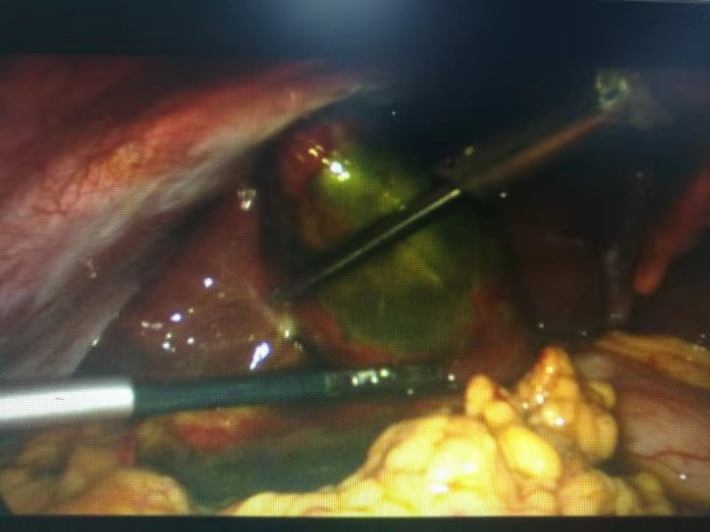 有了周詳?shù)挠?jì)劃,經(jīng)過(guò)充分的術(shù)前準(zhǔn)備,手術(shù)開(kāi)始了。從腹腔鏡下發(fā)現(xiàn),患者膽囊底部壞疽穿孔,膽囊周邊有膽汁滲出。一個(gè)小時(shí)左右,壞疽膽囊和膽結(jié)石被成功取出。