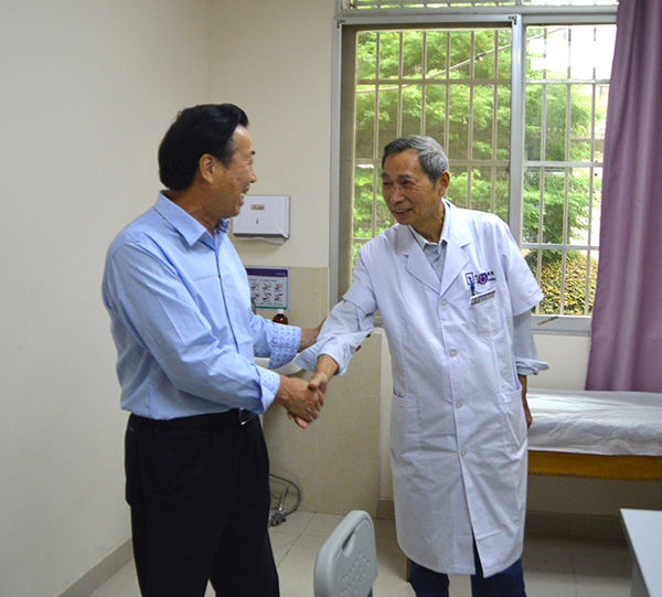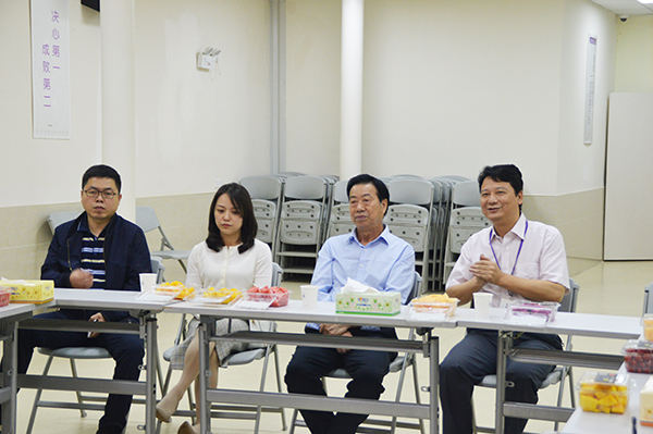 ▲曹學東總裁向市慈善總會陳志剛會長(右一)介紹我院的情況