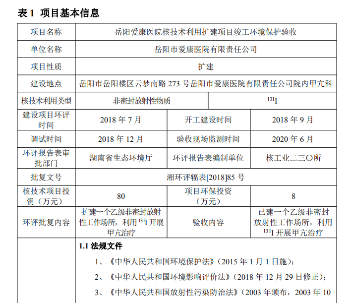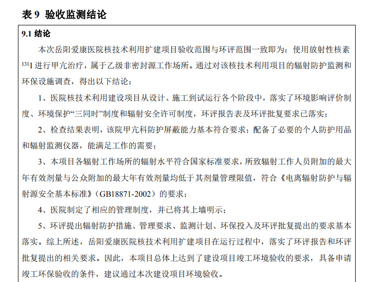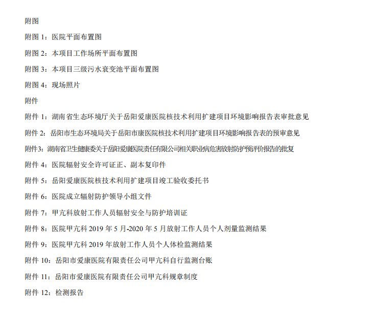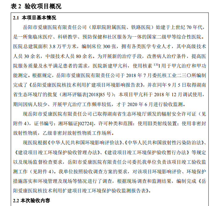 2020 年 11 ? 11 ?,岳陽市愛康醫(yī)院有限責任公司根據(jù)《建設項?竣?環(huán)境保護驗收暫?辦法》、環(huán)境影響評價報告表及批復?件等要求,組織有關(guān)專家和單位召開驗收會議(驗收組名單?簽到表),對核技術(shù)利?擴建項?(已建?個?級?密封放射性?作場所,利? 131I 開展甲亢治療)進?竣?環(huán)境保護驗收,驗收組部分成員進?了現(xiàn)場踏勘、查閱了資料,形成如下意見:
