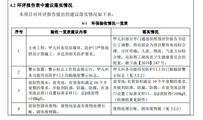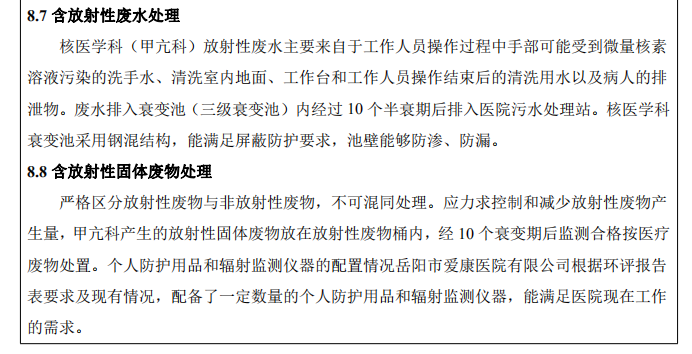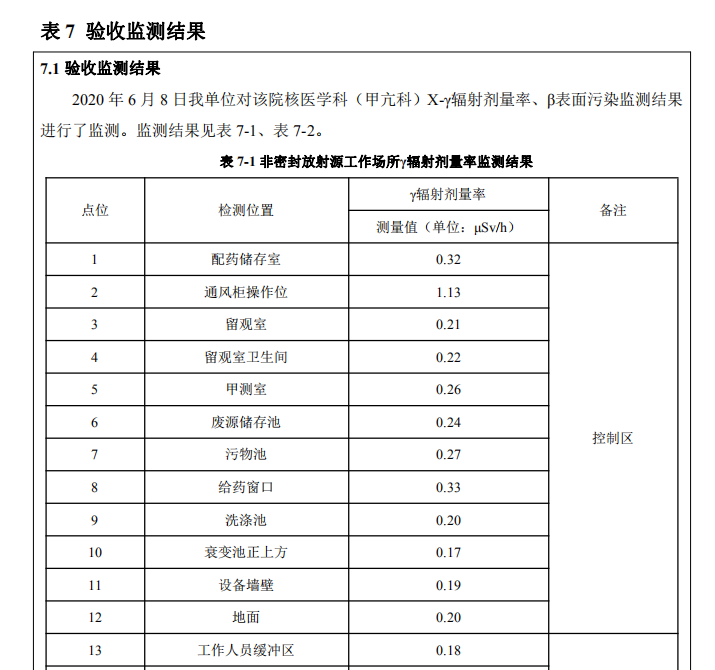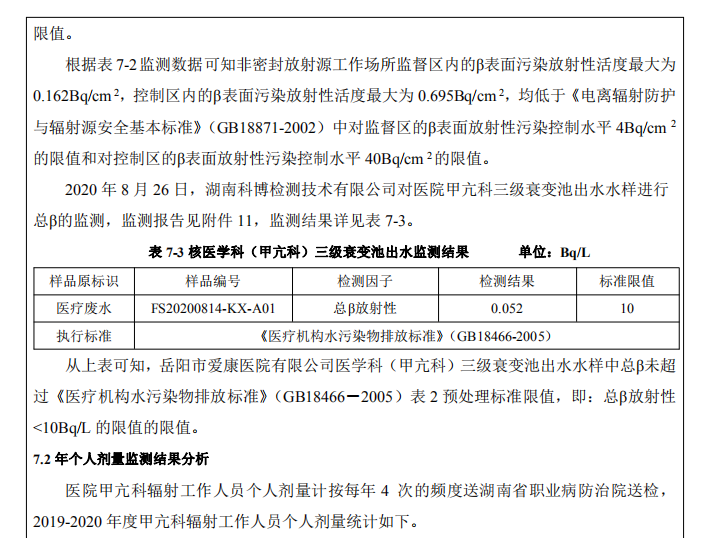 根據(jù)湖南凱星環(huán)保科技有限公司對岳陽愛康醫(yī)院核技術(shù)利?擴建項?現(xiàn)場驗收監(jiān)測報告數(shù)據(jù)顯示:各監(jiān)測點位γ輻射劑量率、放射性β表?沾污、廢?總β,均滿?環(huán)評報告表中的有關(guān)要求。