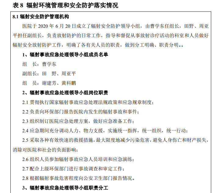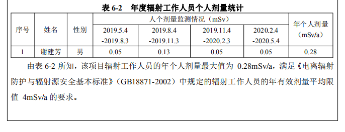根據(jù)湖南省職業(yè)病防治院出具的 2019 年-2020 年年度的岳陽市愛康醫(yī)院有限責任公司個?劑量監(jiān)測報告顯示:輻射?作?員的個?劑量均滿?環(huán)評報告中的有關(guān)要求。