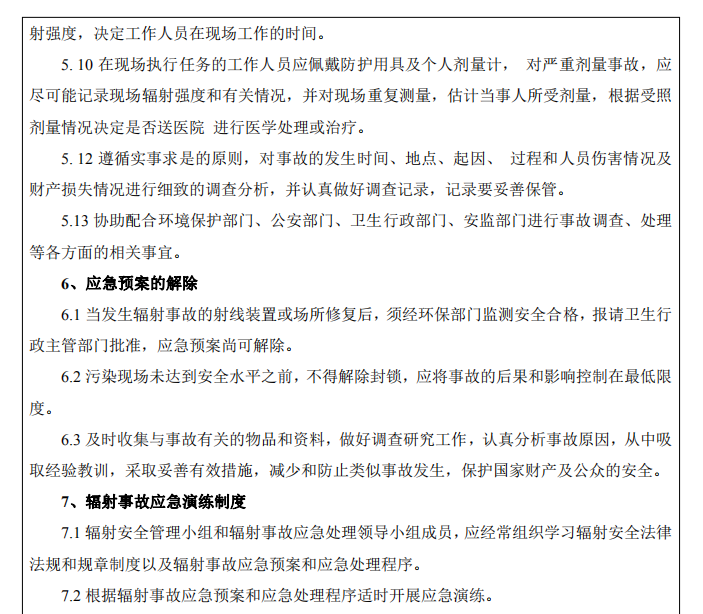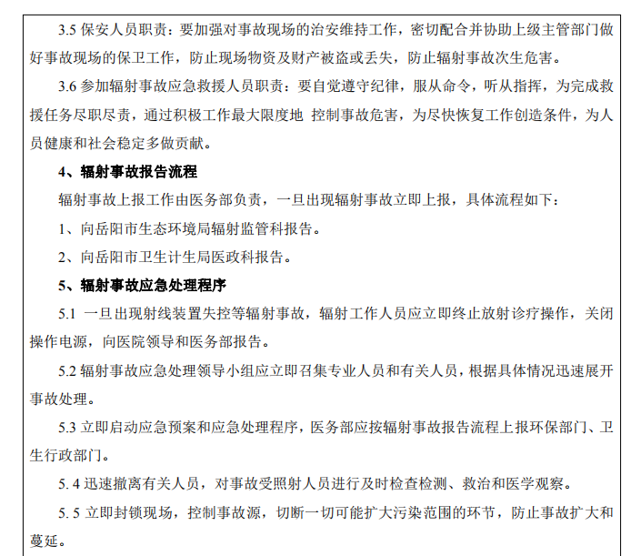 (4)進?步完善輻射事故應急處理預案和輻射防護管理制度。加強放射?作場所的組織管理?作,切實執(zhí)?相關(guān)管理制度及操作規(guī)程,保護放射?作?員。